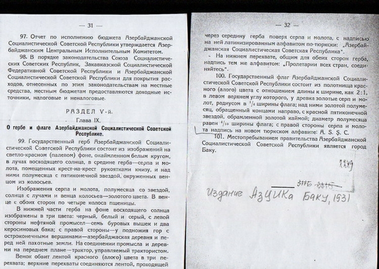 Окончательно переход тюрко-татарской письменности на латинизированный алфавит был установлен постановлением ЦИК Азербайджанской ССР от 1 января 1929 года, в соответствии с которым из описания флага в статье 104 Конституции (Основного Закона) Азербайджанской ССР были убраны слова на «старом». С 1930 года на флаге Азербайджанской ССР изображалась аббревиатура «АССР» только на латинизированном алфавите. Это было закреплено в новой редакции Конституции (Основного Закона) Азербайджанской ССР, принятой 14 февраля 1931 года VII Всеазербайджанским съездом Советов[22].