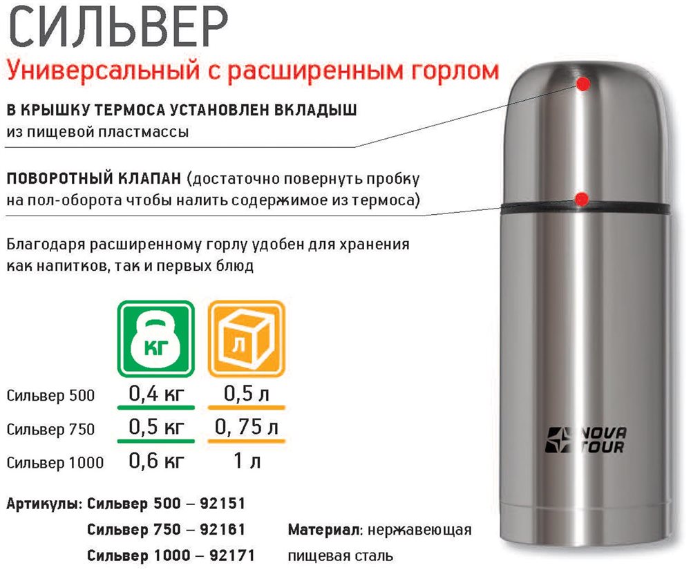 Выбрать, заказать и купить Термос Сильвер 500 можно в интернет-магазине Форма-одежда. Описание с фотографиями и отзывы покупателей - все для вашего удобства выбора. В Москву, Московскую область (Подмосковье) его доставит курьер, а почтой России или другими компаниями отправляем в Санкт-Петербург (СПб), Астрахань, Барнаул, Белгород, Брянск, Великий Новгород, Владивосток, Волгоград, Вологду, Воронеж, Екатеринбург, Иваново, Ижевск, Йошкар-Олу, Иркутск, Казань, Казахстан, Калининград, Калугу, Кемерово, Киров, Краснодар, Красноярск, Курск, Липецк, Магадан, Магнитогорск, Набережные Челны, Нижний Новгород, Новокузнецк, Новороссийск, Новосибирск, Норильск, Омск, Орел, Оренбург, Пензу, Пермь, Псков, Ростов-на-Дону, Рязань, Самару, Саратов, Севастополь, Симферополь, Смоленск, Сочи, Ставрополь, Тверь, Тольятти, Томск, Тулу, Тюмень, Улан-Удэ, Ульяновск, Уфу, Хабаровск, Чебоксары, Челябинск, Якутск, Ялту, Ярославль и другие регионы. Также возможна доставка в страны ближнего и дальнего зарубежья.