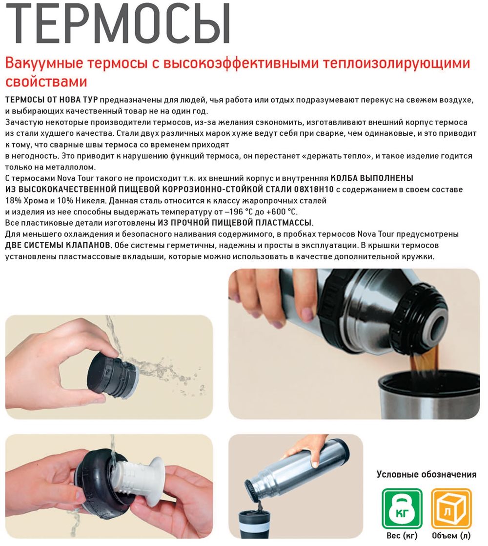 Технические характеристики: Технические характеристики: Материал Пищевая нержавеющая сталь сталь Посмотреть все товары по тегу сталь марки 304 Вес (кг) 0,76 Вместимость (л.) 1 термос с широким горлом поворотный к...