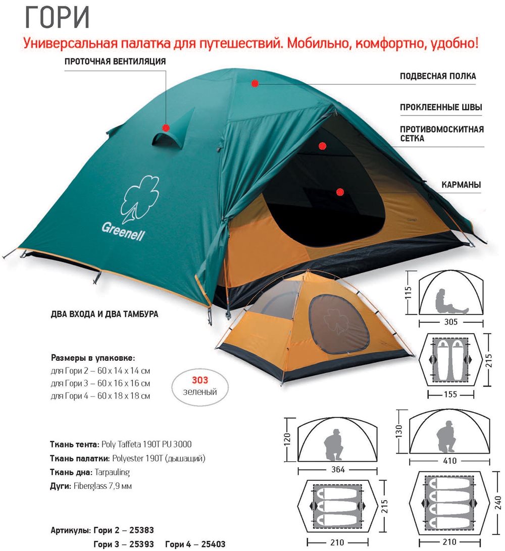 Поздравляем вас с приобретением! При надлежащем уходе данная палатка прослужит вам долго. Пожалуйста, ознакомьтесь с данной инструкцией, прежде чем устанавливать палатку и сохраните ее для справок в дальнейшем. Палатка "Гори" идеально подойдет для путешествий. Палатка устанавливается на разборном дуговом каркасе, имеет плотное непромокаемое дно и два входа на молнии.