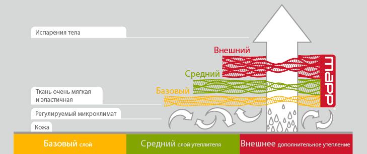 Важную роль в экипировке играет выбор базового – прилегающего к телу – слоя. От него зависит, как хорошо будет отводиться от тела влага, и скоро ли нужно будет снова стирать одежду из-за неприятного запаха. Традиционно в качестве базового слоя выбирают термобелье из полиэстера. Это синтетический материал, хорошо зарекомендовавший себя на рынке спортивной одежды. Благодаря своим свойствам еще в конце 60-х годов он вытеснил традиционные натуральные материалы для базового слоя – хлопок и шерсть. В отличие от них, густо переплетенные синтетические волокна полиэстера не впитывают воду внутрь волокон. Водяные пары с поверхности тела свободно проникают сквозь сеть пор в структуре ткани, отводя влагу от тела. Это обеспечивает комфортное ощущение, как будто одежда на вас сухая, даже во время активного движения. И вы не замерзнете, когда остановитесь, так как тепло вашего тела не будет расходоваться на испарение влаги с поверхности кожи.