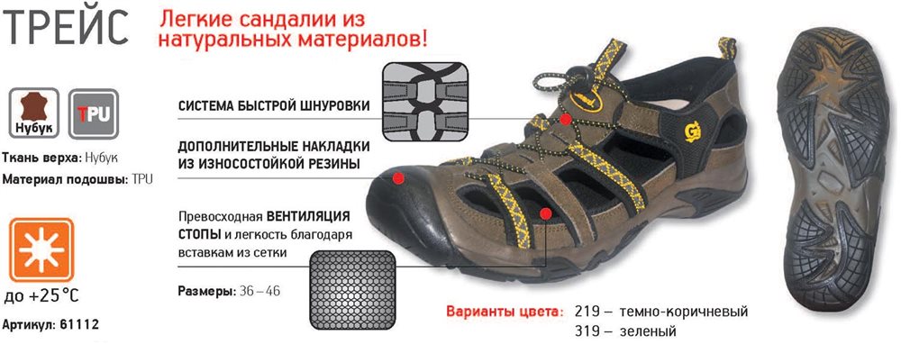 Универсальные трекинговые сандалии с защищенным мысом и прочной подошвой. Изготовлены из комбинации кожи и замшы. Надёжно фиксируют стопу. Предназначены для использования в жаркую погоду при температуре от +35 о С до +20 о С