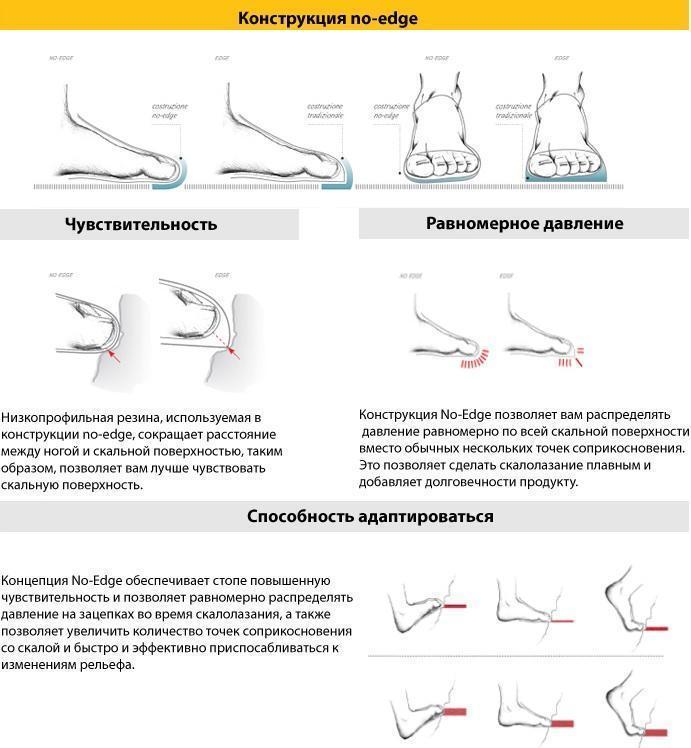 La Sportiva использует резину двух видов - «XS Grip2» и «XS Edge». «На всех женских моделях ставится «XS Grip2», на мужских - «XS Edge». Чем это объяснить?» - «Женщины, как правило, легче мужчин и для того, чтобы создать дополнительное трение - сцепление на мизерах при недостатке веса, лучше подходит более мягкая резина «XS Grip2», при достаточном мужском весе - «XS Edge». В ультра соревновательных моделях - Solution, Тestarossa нет разграничения на мужской - женский - везде «XS Grip2». Но чем лучше стоит резина в трении, тем быстрее стирается - «палка о двух концах».