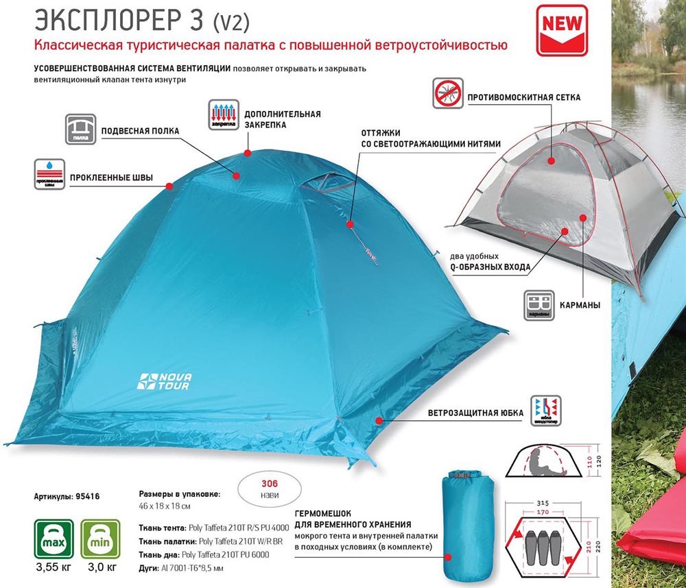Купил палатку Эксплорер 3 В2, это новая ее версия. пришёл с похода. Сказать можно, что прочно прошита палатка, а дуги не сломает не один ветер и турист. Есть юбка, это очень крутая вещь - в палатку не задувает и не затекает дождь (нас застал реальный ливень) . Спали в ней вдвоем и рюкзаки - места достаточно, для троих тоже думаю нормально будет. Есть карманы внутри для мелочей. В целом палаткой доволен.