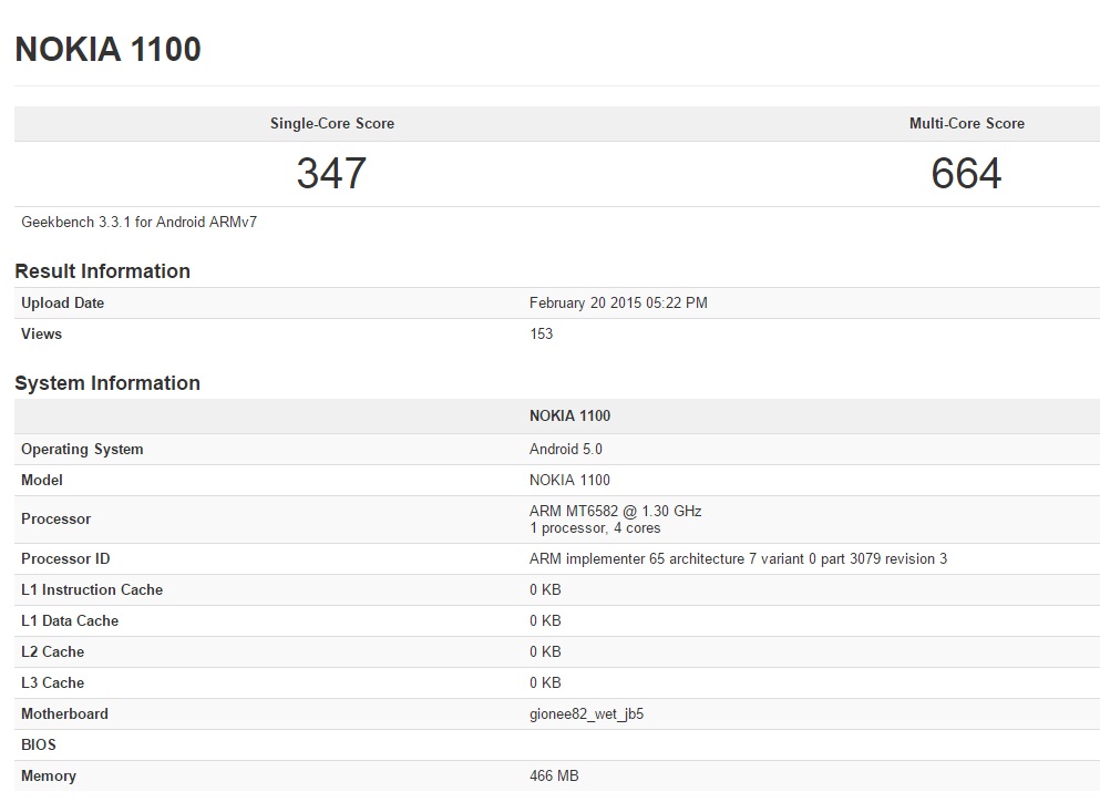 The Nokia 1100 appeared on a Geekbench test packing a 1.3GHz MediaTek MT6582 quad-core CPU – the same processor that powers the Sony Xperia E4, Huawei Honor 3C Lite, and Lenovo A5000.