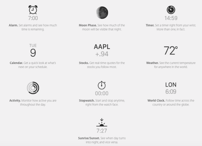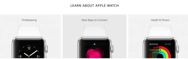 На официальном сайте Apple.com появились три новых раздела, которые посвящены Apple Watch. Это Timekeeping, New Ways to Connect и Health & Fitness. Первый раздел посвящён описанию раздичных вариантов циферблата, а также тому как использовать Apple Watch в качестве точного и многофункционального хронометра. Он сочетает в себе функции секундомера, таймера, будильника и календаря.